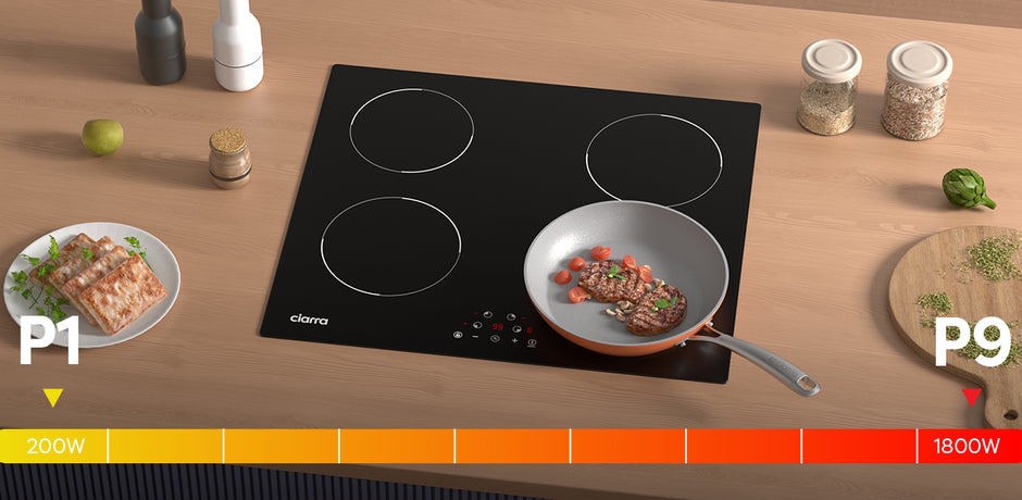 The CIARRA CABBIH4-D features 4 cooking zones, each with 9 power levels. The left front and right rear zones have 1800W power, while the left rear and right front zones have 1200W power. This gives you flexible cooking options for various types of dishes.