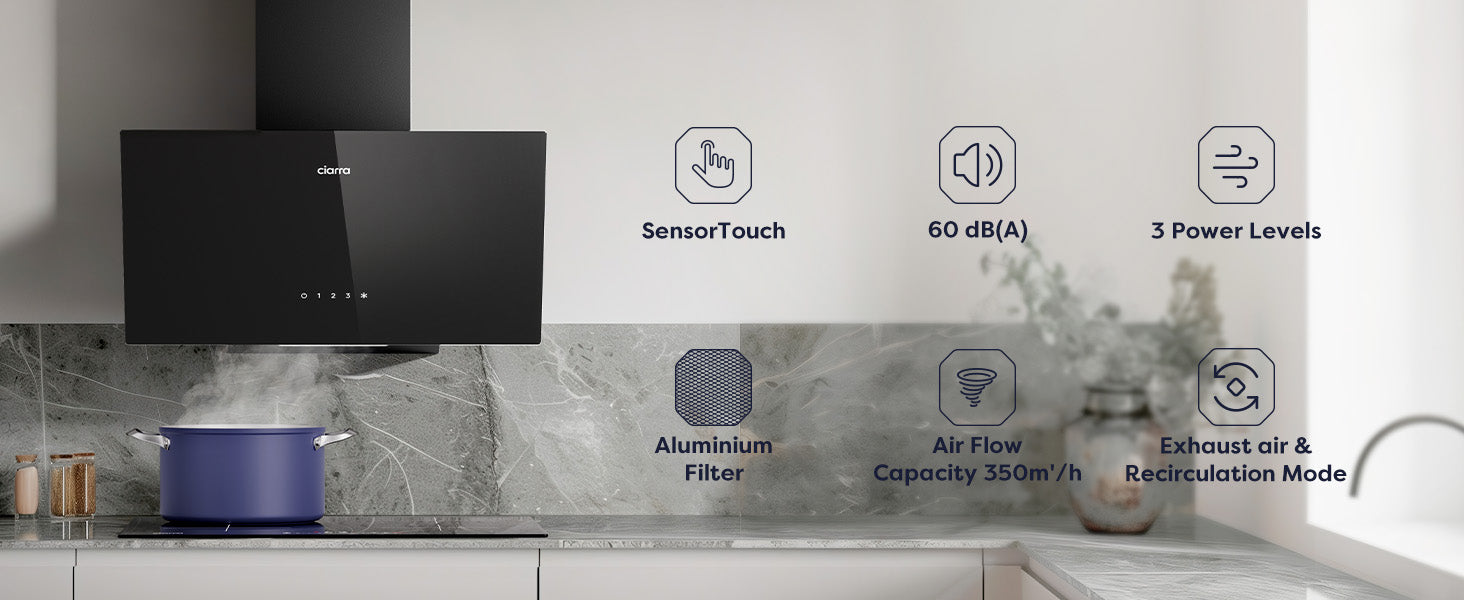 CIARRA 60cm A++ Angled Cooker Hood – Black Glass Recirculating Cooker Hood, 350m³/h Touch Control CBCB6750C-OW