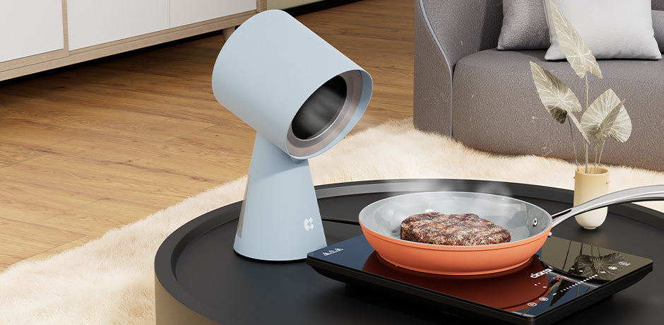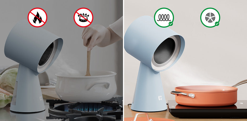 - ⚠️Attention⚠️: HOOD TO GO is recommended for use with cooking appliances (eg. induction cooker, electric grill, electric heating cooker, etc, and can not be used for open flame cooking. The air inlet should be as close as possible to the cooking surface of other appliances (no more than 10cm away) to improve the efficiency of the extraction rate.