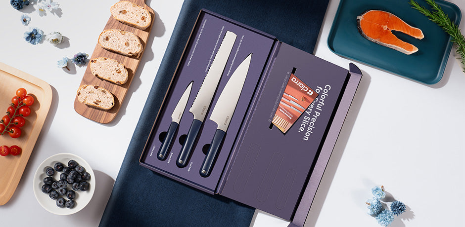 Ciarra Beyond Trio Knife Set with Gift Box, with Chef Knife, Serrated Bread Knife and Utility Paring Knife, High Carbon Stainless Steel with Ergonomic Handle | Midnight Dream